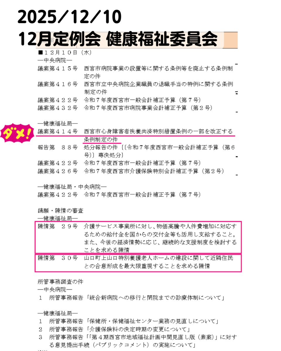 ❌【議案第414号】西宮市の心身障害者扶養共済制度は他市より充実していましたが、財政構造改善のため、見直すことに。佐野は反対いたしました。心身障害者やご家族のための経済的なインフラとなっていたこの制度。30年の不況、賃金停滞、増税の中で、生活者は四苦八苦しています。今、削るべきものは福祉ではないと思います。