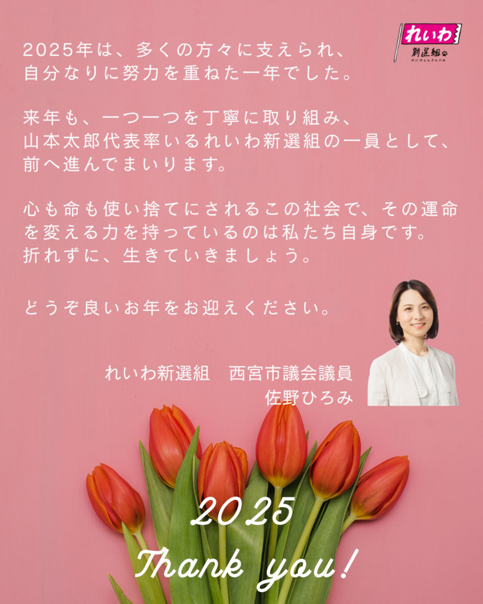 来年も、一つ一つを丁寧に取り組み、山本太郎代表率いるれいわ新選組の一員として、前へ進んでまいります。