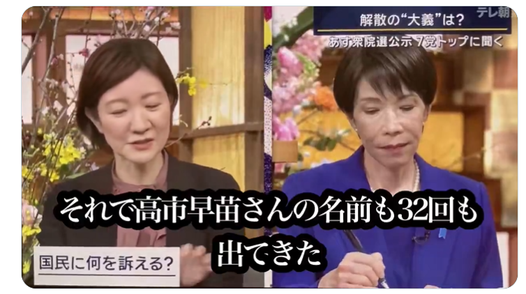 「統一教会の問題があるじゃないですか。真のお母さま報告書という新たな文書が出てきて高市早苗さんのお名前も32回も出てきた。これ、ご自分で説明されていませんのでね」