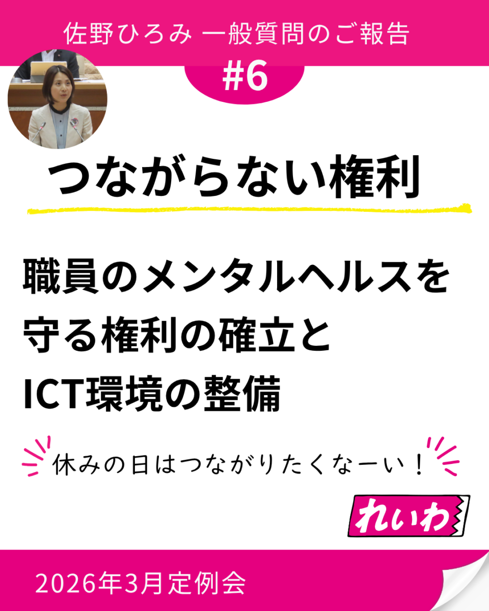 つながらない権利を実効性のあるものにするため、次のシステム更新時には、必要な機能として「予約送信機能」を必ず導入頂けますよう、お願いいたします。私自身もガルーン(庁内のメールシステム)の利用者の一人として、まずは勤務時間外に連絡をしないと、自ら配慮してまいります。